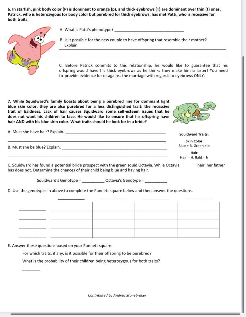 Problemsrelated to incomplete dominancewith poofkins (a special kind offlower) and goobers (a special breed of jellyfish!) spongebob genetics & more from the science spot website. Create a punnett square to show the possibilities that would result if spongebob and spongesusie had children. Science spot spongebob genetics answers. Only a spongebob expert can answer these 16 trivia questions. If spongebob is heterozygous for his yellow body color, what are the chances that the baby sponge will be blue?