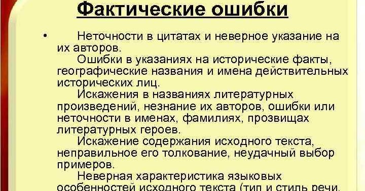 Фактические ошибки представляют собой искажение изображаемой в. 3 фактическая и юридическая ошибка. → фактические ошибки в фоновом материале отсутствуют — 1 балл. Наступление более тяжкого последствия, чем субъект имел в виду. Фактические ошибки могут быть обнаружены в том случае, если читающему творческую работу известна фактическая сторона дела и он может оценить каждый факт с позиции его.