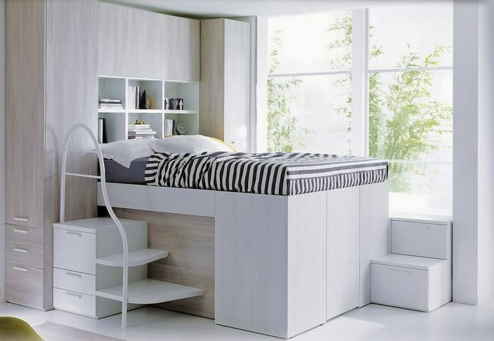 Il letto rialzato con sotto l'armadio è un'ottima idea per salvare spazio: